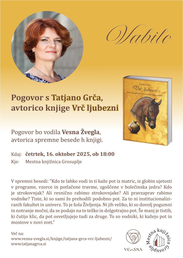 V prijetnem ambientu Mestne knjižnice Grosuplje sem ob globokih vprašanjih Vesne Žvegla spregovorila o svoji poti preko tesnobe do pozabljene travme, pomenu razreševanja družinskih travm za posameznika in družbo. Obiskovalci so se po intimnem pogovoru izpovedali tudi sami s svojimi zgodbami in preizkušnjami. Tako vedno nastane odprt in varen prostor za deljenje svoje ranljivosti in moči.
